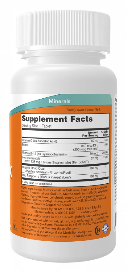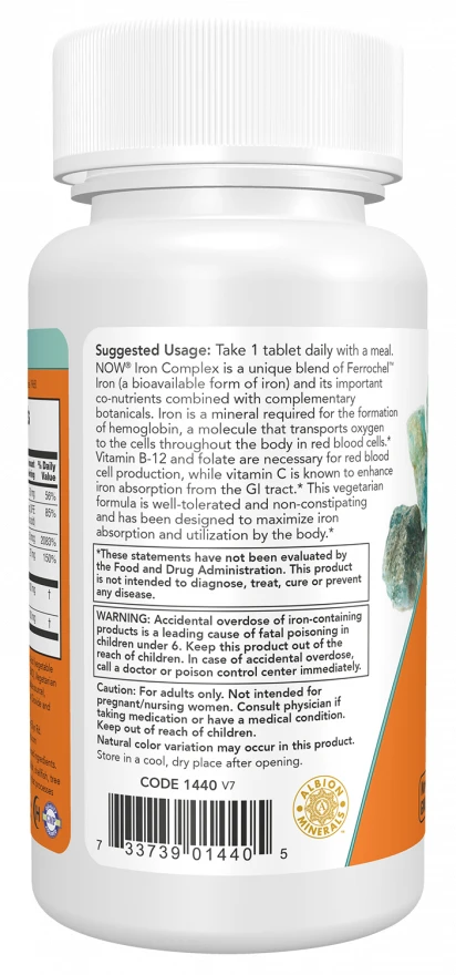 Opdag NOW Foods Iron Complex Vegetarian, et praktisk supplement designet til daglig brug. Denne vegetarvenlige formel indeholder 100 tabletter pr. pakke, hver med 27 mg jern i form af bisglycinat. Jernbisglycinat er kendt for sin effektive absorption.