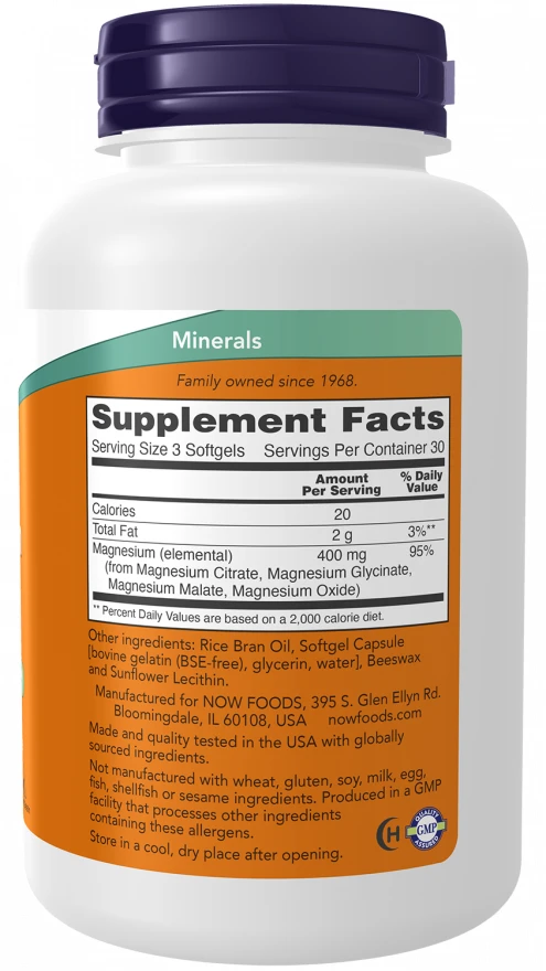 Opdag NOW Foods Magnesium Citrate 400 mg, et supplement fremstillet med en blanding af forskellige former for magnesium. Dette produkt kombinerer magnesiumcitrat, magnesiumglycinat, magnesiummalat og magnesiumoxid i én samlet formel for at sikre bred biotilgængelighed.