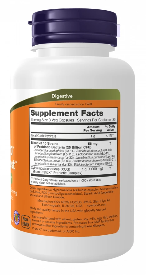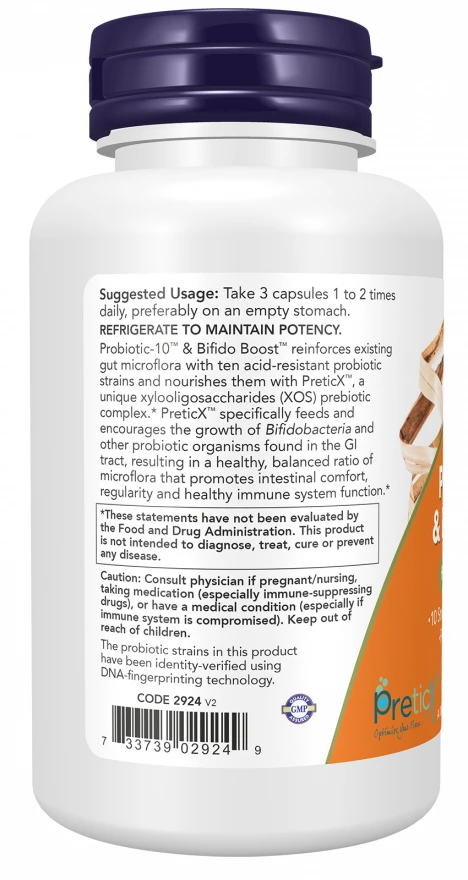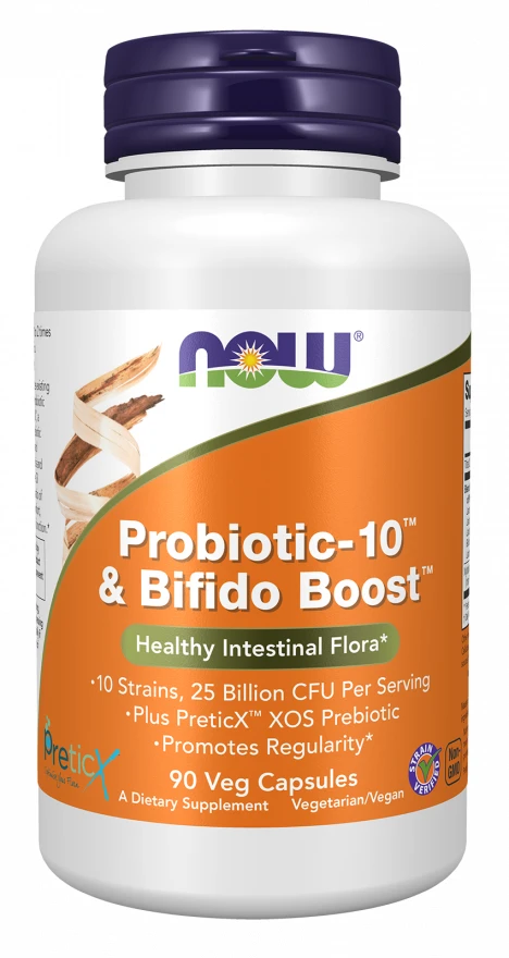 Opdag NOW Foods Probiotics-10 & Bifido, et supplement designet med fokus på kvalitet og naturlige ingredienser. Dette produkt indeholder en blanding af ti syreresistente probiotiske stammer samt PreticX,et unikt xylooligosaccharider (XOS) prebiotisk kompleks.